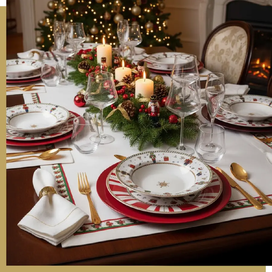 Ogni set, un'armonia perfetta di piatti, bicchieri, tovaglie e posate, è pensato per trasformare ogni pasto in un'occasione speciale.